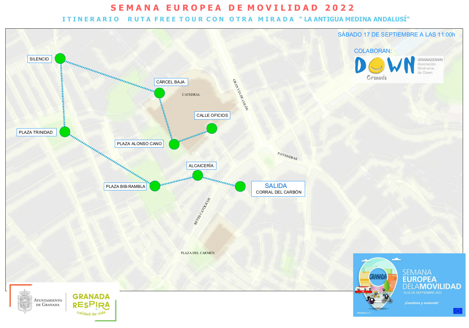 Ruta: Corral del Carbón, Alcaicería, Plaza Bib-Rambla, Plaza de la Trinidad, Calle Silencio, Calle Cárcel Baja, Plaza Alonso Cano, Calle Oficios.