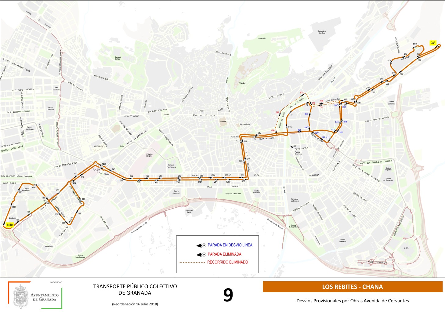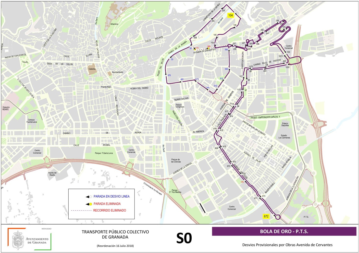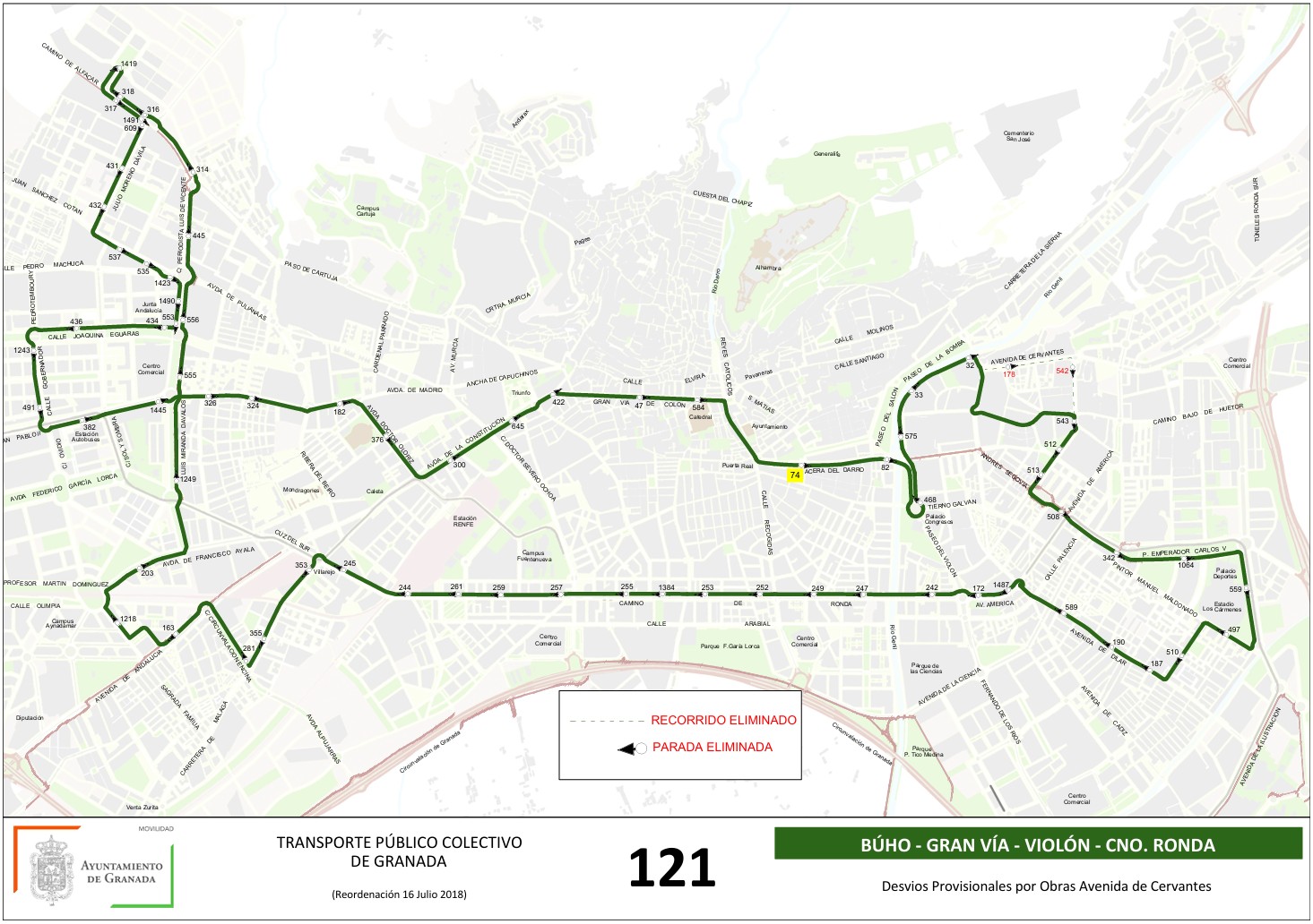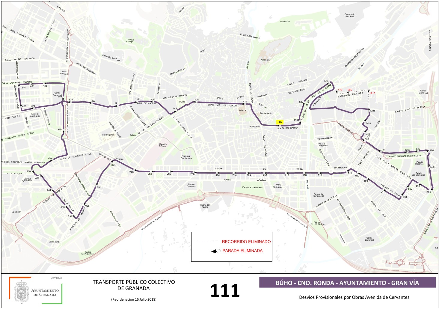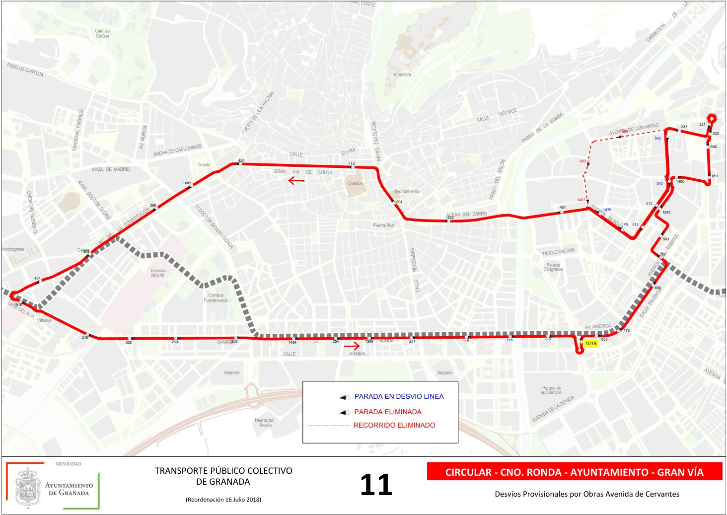 Se anula el recorrido por C/ Sancho Panza, Avda. Cervantes y C/ Puente Verde. Se desvía por: Camino Bajo de Huétor, Callejón del Pretorio y Paseo de los Basilios, con las paradas a demanda por ser una línea búho.